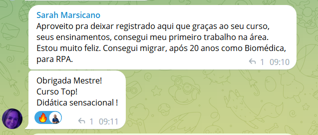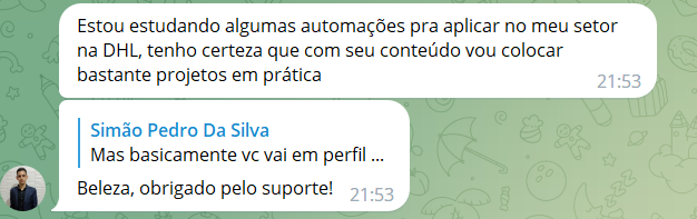 Você terá acesso ao grupo de Telegram onde os alunos compartilham suas experiencia em projetos reais. O que ira levar o seu aprendizado para o proximo nivel.